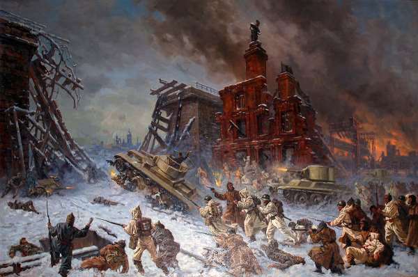 Дух Победы. Берлин 1945-го ![]() Владимир Гребнев. Красноармейцы бегут мимо разрушенной церкви на улице Берлина. Апрель 1945 Война сама по себе является сильнейшим испытанием для любого человека в отдельности и человеческих коллективов вообще. Смерть, грязь и лишения, из которых война, в основном, состоит, воздействуют на людей и целые народы подобно кузнечному горну, выжигая все второстепенное и оставляя стальной стержень, без которого невозможно выстоять и победить. А потому в жестких условиях войны ярче всего проявляются высшие достижения человеческого духа и разума. Великая Отечественная — наиболее трудная и масштабная из всех войн, вынесенных русским народом, который уверенно можно назвать «самым воевавшим» за последнее тысячелетие мировой истории. Финал и апофеоз этой войны — битву за Берлин — справедливо можно рассматривать как последний поединок двух равных по силе, но абсолютно полярных по морали противников. Заявка на превосходство по праву рождения — против веры в высокое предназначение каждого представителя рода человеческого. Даже весной 45-го фашистское «черное солнце» не желало сдаваться и длило существование своего царства привычным методом жертвоприношений. Тысячи повешенных за дезертирство немецких солдат, «украшавших» улицы городов и деревень Германии, принуждали оставшихся к бесперспективному сопротивлению, и они гибли под гусеницами русских танков, пытаясь спасти агонизирующий организм «черного рейха». Фашистский вермахт не надеялся на пощаду и сражался как прижатый к стене кровавый хищник. С другой стороны был советский солдат, не пожалевший ничего для победы. В его руке был меч, занесенный для добивающего удара. Его мужество не зависело от благосклонности мрачных древних божеств. Свои силы он проверил на деле и многократно преумножил опытом трудных побед. Он шел не карать и не мстить, а просто смести с лица земли абсолютное зло. На тему Берлинского сражения приходится встречать множество рассуждений — от откровенно дилетантских до глубокомысленно конспирологических. И в большинстве своем безграмотных. Мы попробуем развенчать наиболее лживые и одиозные мифы об этом без преувеличения уникальном сражении. Только еще раз повторим, что немецкий вермахт вовсе не собирался сдаваться «азиатским варварам» и был готов сражаться до конца. Как и Красная Армия, он имел высочайшую мотивацию и гигантский боевой опыт, выкованный четырьмя годами взаимных сражений. Итак, вот первое из многих исторических заблуждений, точнее, непониманий: в феврале 1945-го года после головокружительно успешной Висло-Одерской операции Красная Армия вышла на рубежи, которые находились в 70 км от Берлина — и вдруг остановилась на два месяца. Казалось бы, зачем? Надо было не ждать, а двигаться вперед, скорее заканчивать войну! На самом деле в этой остановке, конечно же, была жесткая военная логика, которую надо бы постичь всем, пишущим и рассуждающим о войне. Логика была в том, что в феврале и марте 1945-го года велись бои за удержание и расширение захваченных на Одере плацдармов и уничтожались все предпосылки для фланговых ударов противника, способных как минимум парализовать любую попытку двигаться к Берлину. А такие возможности фланговых ударов у немцев были, например, со стороны нависавшего с севера так называемого «Померанско