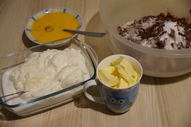 Остальное все как обычно – смешиваем сухие ингредиенты, смешиваем сметану с сахаром.