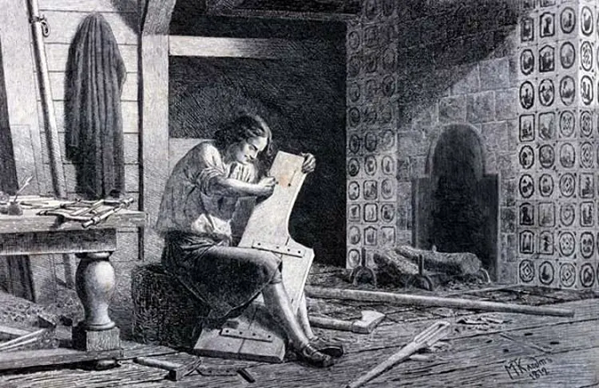 ![]() Михаил Петрович Клодт фон Юргенсбург Петр І за изготовлением руля. 1872 г. Пётр Первый широко известен Своей любовью к кораблям. И среди прочих интересов, Любил и мастерить их сам. Запечатлел таким художник, Царя за этим ремеслом. Он,флота основоположник, Руль создаёт своим трудом. |