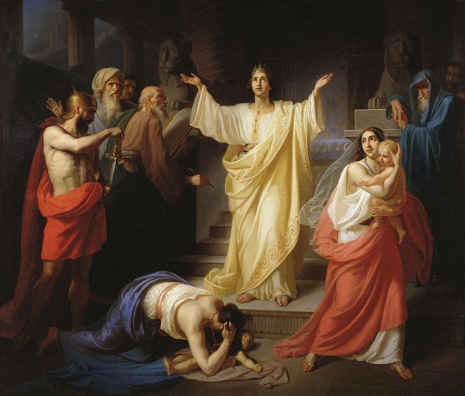 ![]() Основная идея работы Флавицкого — прославление героизма во имя веры. Художник изобразил подземелье у арены Колизея, в котором ожидают неминуемой смерти христиане, среди которых есть старики, женщины и дети. В левой части выделяются образы двух рабов-стражников: один из них открывает массивную дверь темницы, а другой с насмешливо-издевательским видом зовёт мучеников на ярко освещённую солнцем арену Колизея, у другого края которой видны львы. Мужчина с высоко поднятым крестом ведёт за собой на арену мальчика, который, обернувшись, протягивает руку к лежащей на земле женщине с младенцем, в отчаянии пытающейся их остановить. Рядом — две дочери, прижавшиеся к своей матери. В правой части картины изображён слепой старик, покорно идущий в сторону света, исходящего от открытой двери. За ним — в испуге прильнувшие друг к другу молодые супруги. Несколько римских солдат пытаются подтолкнуть к выходу прощающихся друг с другом христиан. Суд Соломона. 1854 год
