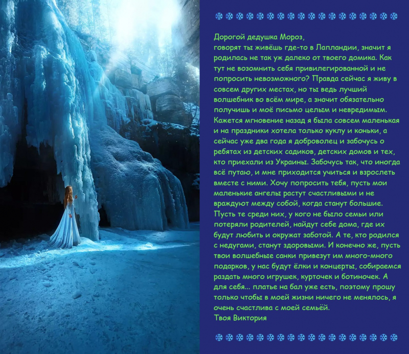 Дедушка Мороз!!! Пишет тебе киберфея Галина. Вот мои три желания - Желание № 1: Я хочу чтобы у всех на Новый год была настоящая снежная и морозная зима, так как последние зимы были тёплыми. Желание № 2: Хочу чтобы люди не болели. Желание № 3: Хочу, чтобы на Кинозале не стало троллей, спамеров, клонов и другой нечисти. ![]() С уважением, киберфея Галина. |