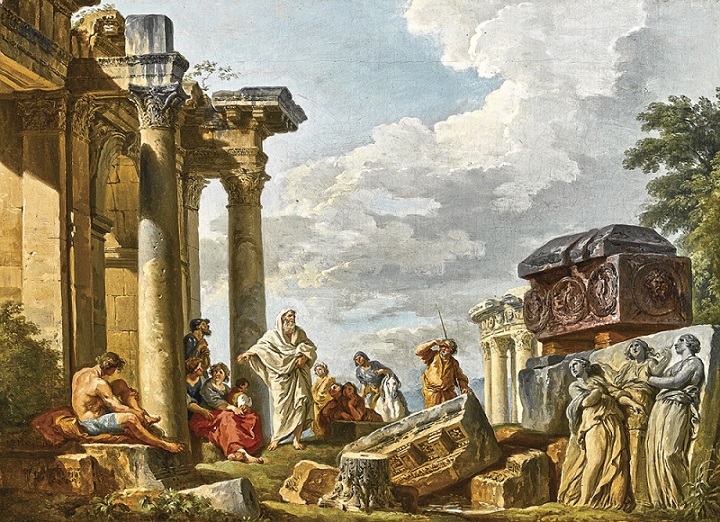 "Каприччио с фигурами среди римских археологических руин, храм Весты в Тиволи и саркофаг Костантина". Панини Джованни